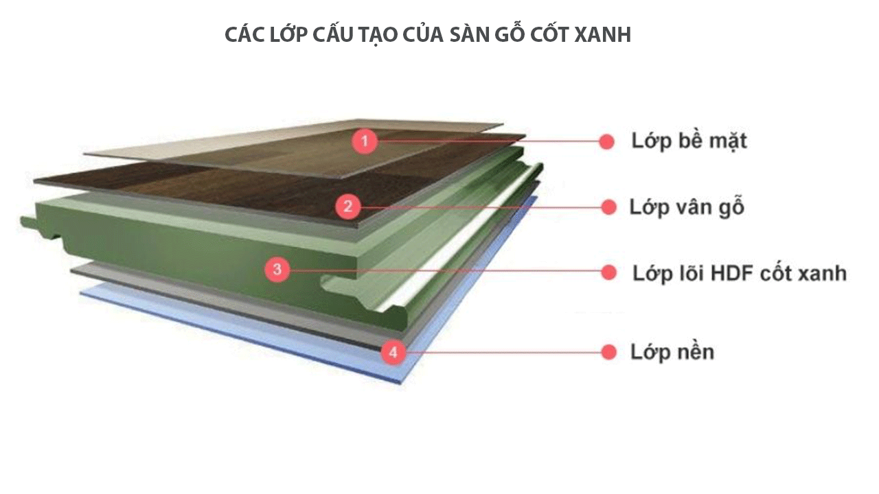 Sàn gỗ cốt xanh cũng có cấu tạo tương tự như nhừng sản phẩm sàn gỗ khác trên thị trường. Các lớp cấu tạo gồm: