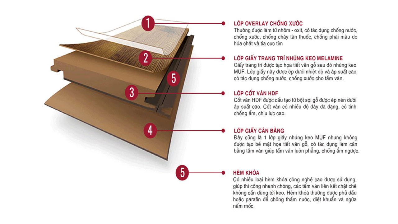 - Lớp 5 là hèm khóa có tác dụng liên kết các tấm sàn thành khối kín khít chống thấm nước và ngừa nấm mốc